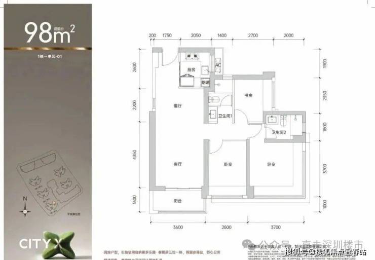 98㎡的3房2厅2卫,1栋1单元01户型,设计的是经典竖厅格局,进门入户玄关,客厅3.6米开间,LDKB一体化设计,动静分区,3个卧室分别做到了主卧14.3㎡/次卧10.36㎡/次卧6.75㎡(包含墙体飘窗),U型厨房,公卫三段式分离,得房率约75.4%(不含赠送),东北朝向。套内面积73.89㎡+赠送面积10.05㎡=实得83.94㎡,加上赠送后得房率约85.65%。还未推售