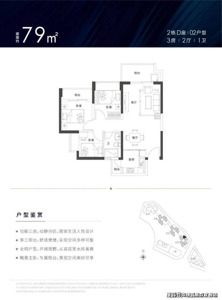 建面约79-129㎡3-4房户型,南北通透,3房3.5~3.7m,4房3.8~4.2m,罕见阔绰开间,客厅、厨房、卧室三阳台多飘窗,超高使用率。
