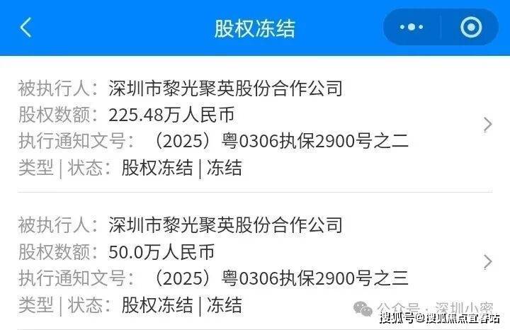 2024年黎光村被开发商起诉,导致2025年村部分股权资产被法院冻结。民间也有声音猜测,或许和鸿荣源顶级地产入局塘坑旧改有关。