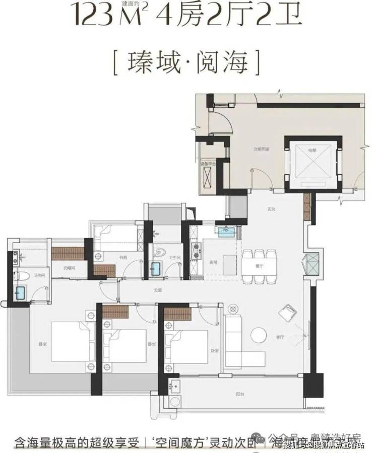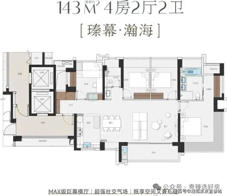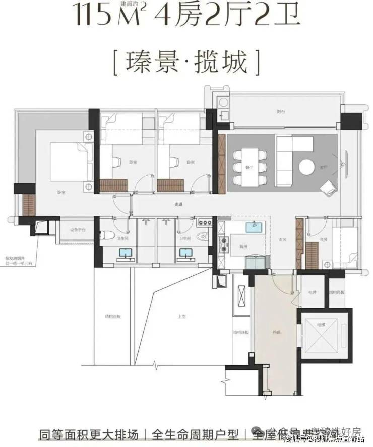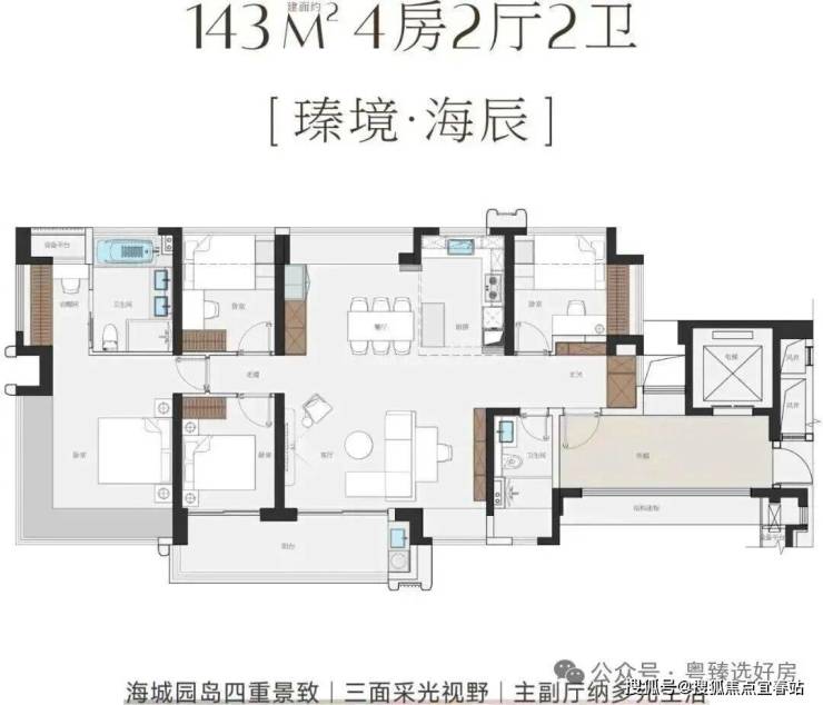 户型方面,主推建面115㎡-143㎡四房,户型使用率超100%,最大可达108%,最高赠送面积近44㎡。