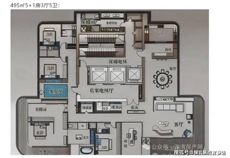 1A栋43层3梯1户,495㎡户型总价破亿,专享360°环幕海景。