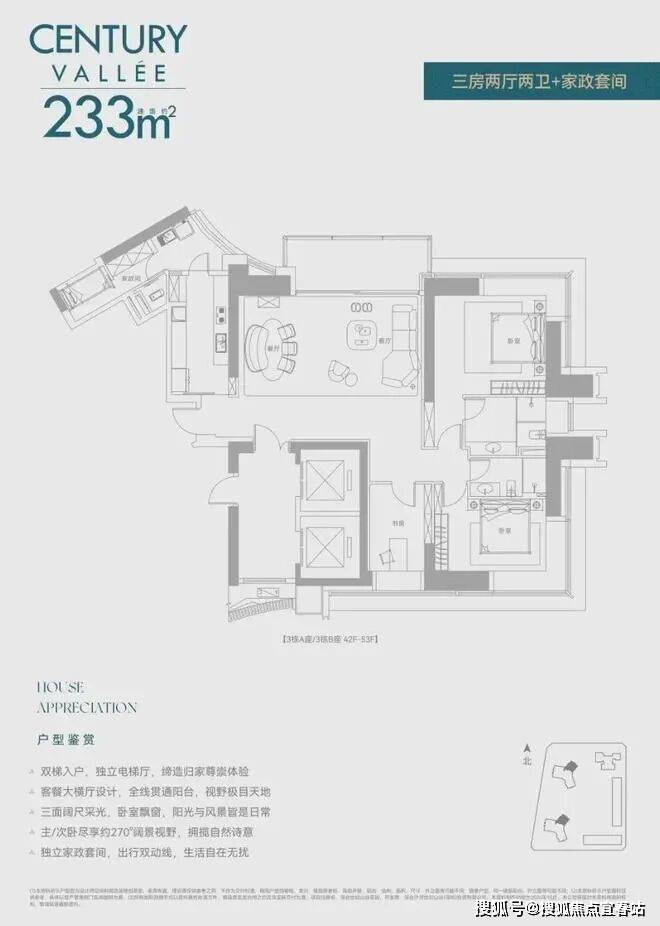 约233㎡3+1房3卫 A户型,西北朝向看名商和沙河高尔夫;