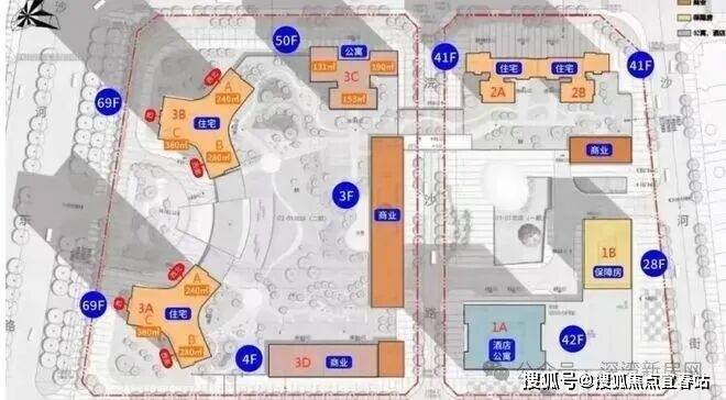 总栋数:8栋(1A栋42层酒店+公寓、1B栋28层保障房,2栋1/2单元41层住宅,3A/3B栋69层住宅;3C栋50层公寓、3D栋4层公寓)