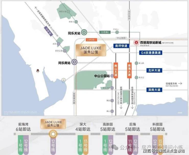 • 12号线同乐南站(约600m),1站中山公园/4站科技园/5站高新园;• 15号线同乐关站(预计2028年12月开通),也被称为深圳“一环线”,• 24号线(规划中)开通后4站高新园;