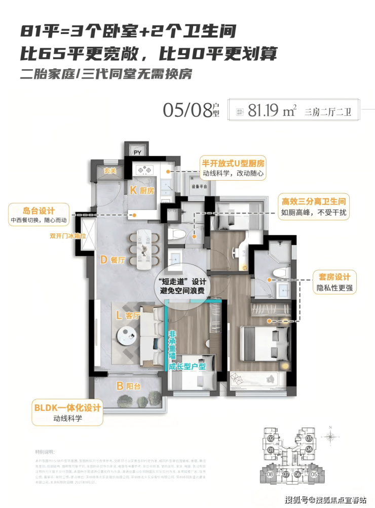 建面约81㎡的三房两厅两卫户型,设计2款,除了具备前一款户型的全部优势特征之外,尺度感更强,并可满足多种人口组合家庭的居住需求。