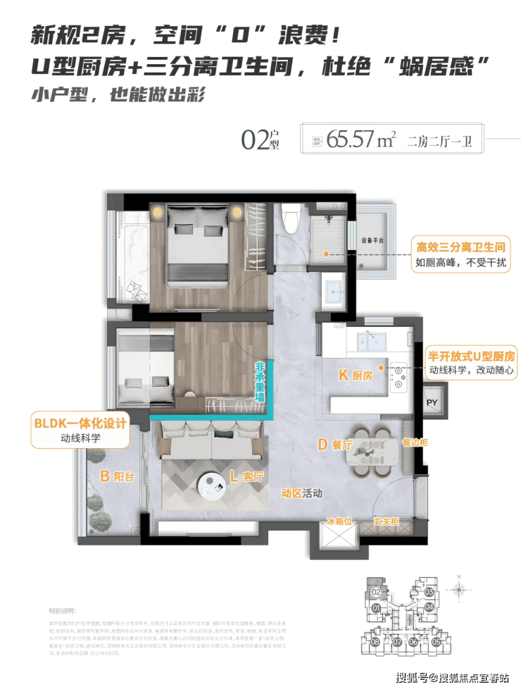 动静分区、干湿分区、可开合U形厨房等前沿设计,丰富了居家层次,强化了体验感。