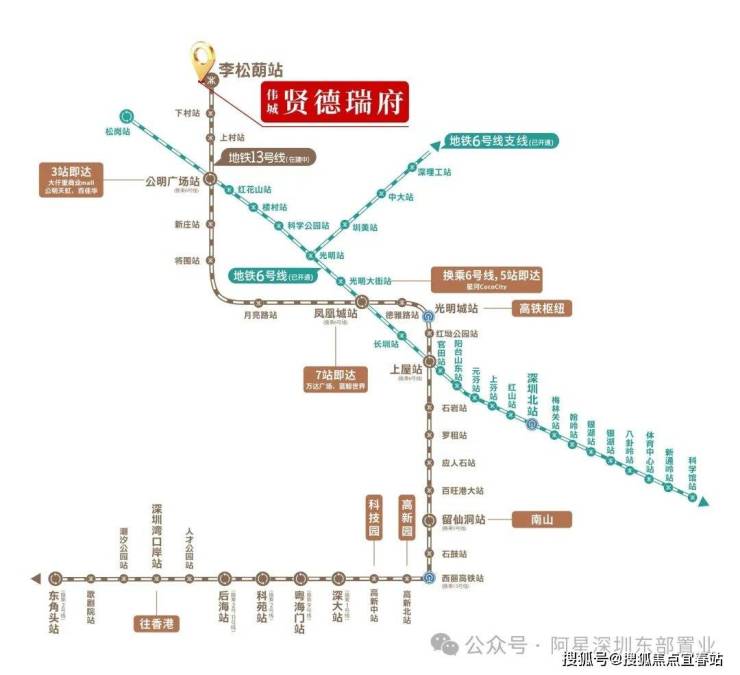 起于李松蓢站,终于东角头站。地铁 13 号线被誉为“科创线”,贯穿深圳南北,串联光明科学城、留仙洞总部基地、南山科技园、深圳湾总部基地等重要科创圈。设计最高速度100km/小时,快速通达“南山科技园”。