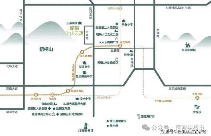 鹏瑞半山云璟,位于盐田区中青路西侧,该项目是在森林覆盖率高达88%的深圳享有城市绿肺之称的最高山脉“梧桐山”半山处,所在片区是盐田新开发的区域,周边均是小区住宅,居住氛围浓厚,紧挨着云海学校,2/8号地铁线“深外高中站”距离约560米,深圳外国语学校高中部距离约800米。
