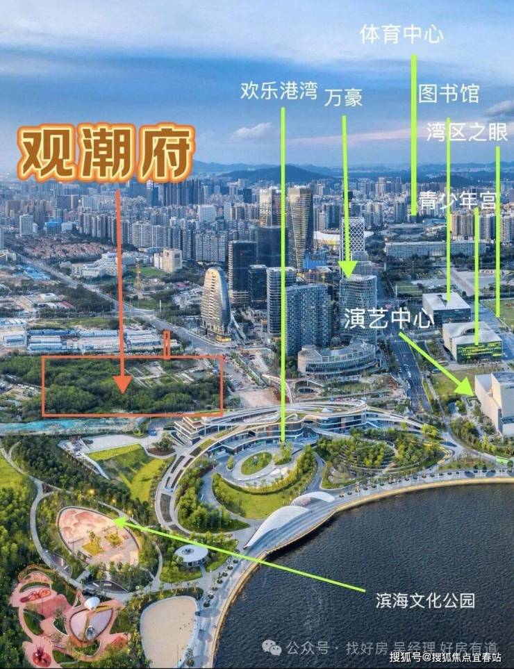 项目东南面正对欢乐港湾的“湾区之光”摩天轮和“湾区之眼”文化综合体,西侧与腾讯企鹅岛隔海相望。