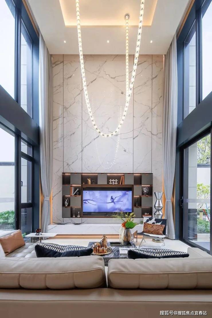 一层LDK一体化设计,约6.4米高挑客厅,约4米开间尺度,双面大落地玻璃的设计,更是直接将室内外界限感抹掉,带来IMAX级的采光面,是家庭的欢聚场所,也是大气的社交空间。