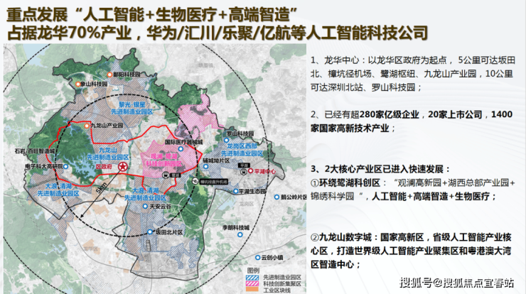 观澜占据龙华70%产业,鹭湖中心城与九龙山数字城双核驱动,聚焦人工智能、生物医疗等高新技术产业;