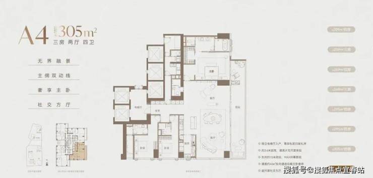 ②高区42F起(150-200米)是约370-375-403㎡4+1房五卫+家庭厅+家政套间;