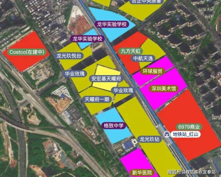 北侧为天虹购物中心,远一点有红山6979、AT MALL上塘荟、Costco华南会员旗舰店(龙华民治店)。