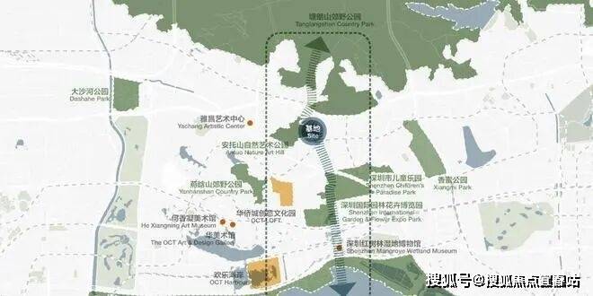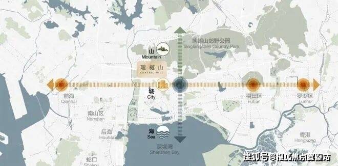 1、中心区域:深圳山海城中轴,左手香蜜湖、右手华侨城,六大总部基地环伺
