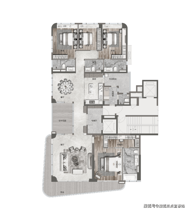 大平层采用的是单梯入户,户型的使用率非常高,我们首先来看看350㎡的大平层(5室2厅5卫),高层是带德系精装修交付的。