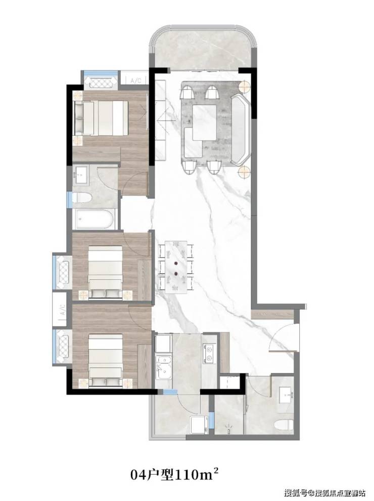 04户型:约110㎡,三房两厅两卫带主套