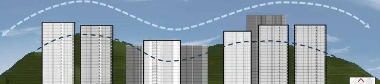 建筑布局南北朝向,山体走势与楼体朝向形成高差,自然微风在社区内穿梭流动,形成舒适的微风人居环境
