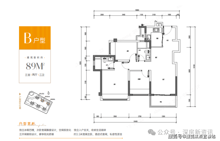 89㎡的3房2厅2卫,设计的是经典竖厅格局,客厅3.3米开间,三开间朝南,3个卧室分别做到了主卧14.15㎡/次卧8.37㎡/次卧8.3㎡(包含墙体飘窗),得房率79.77%(不含赠送),西南或东南朝向。