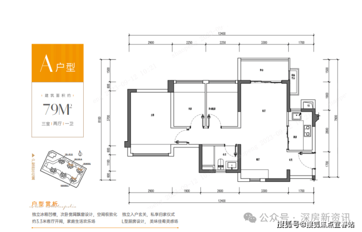 79㎡的3房2厅1卫,设计的是竖厅南北通透格局,客厅3.3米开间,主卧南北通双飘窗设计,3个卧室分别做到了主卧11.99㎡/次卧6.14㎡/次卧6.12㎡(实测面积,去掉墙体),得房率:79.78%(不含赠送)主朝东北或西北向。