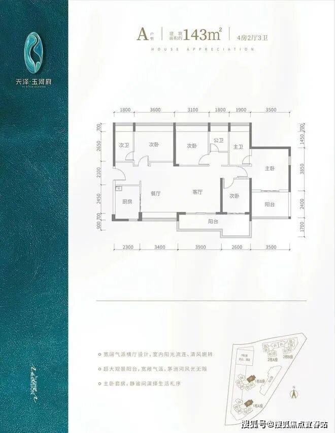 A户型-143㎡-4房2厅3卫,设计的是横厅南北通透格局,客餐厅开间7.3米,超大观景阳台6.5米长,全屋飘窗设计,主卧套房设计。