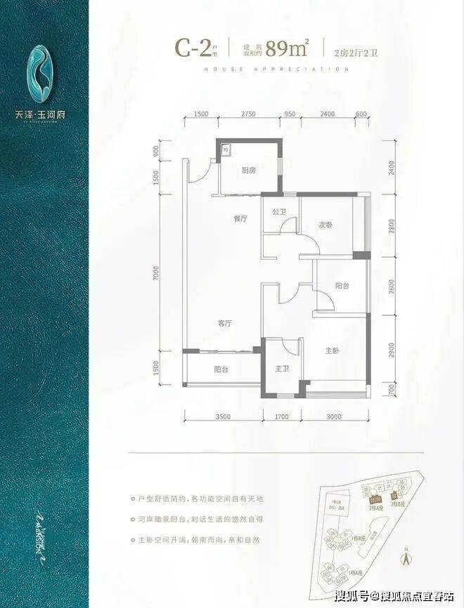 C2户型-89㎡-3房2厅2卫,设计的是竖厅格局,客厅3.5米开间,主卧及客厅阳台都朝南向。