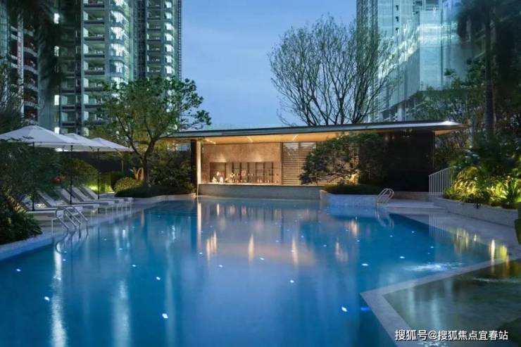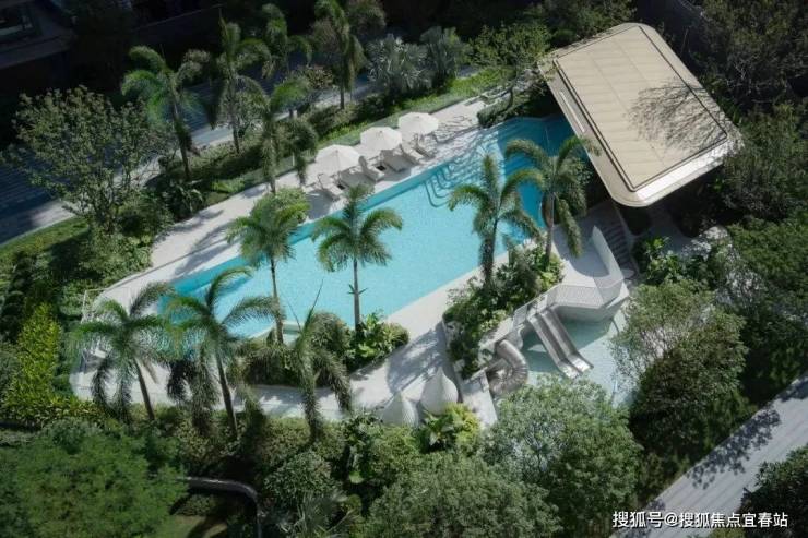 更震撼的是,社区既有成人泳池、儿童戏水池以及度假会客厅,还设置了躺椅、凉亭、水吧台等,度假风拉满。