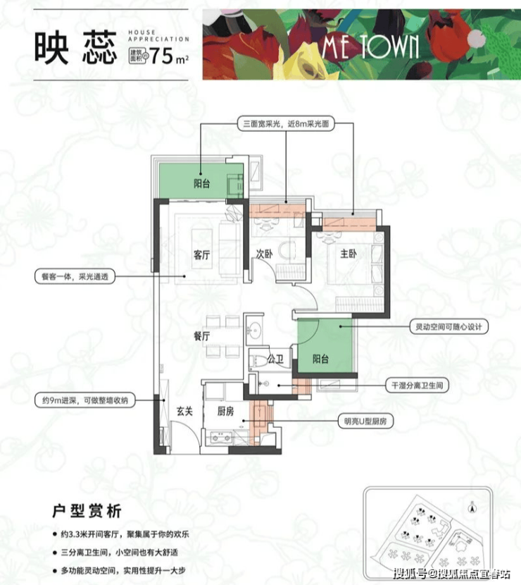 75平的三房两厅一卫,传统竖厅设计,客厅、主卧、次卧三开间朝北,三分离卫生间,最大限度解决业主起居便利问题。