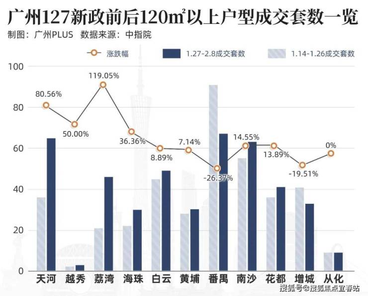 从各区120㎡以上户型成交量在新政前后两周的对比变化可以看出,在天河、越秀、荔湾、海珠这中心四区,120㎡以上户型成交量确实出现了明显增长。