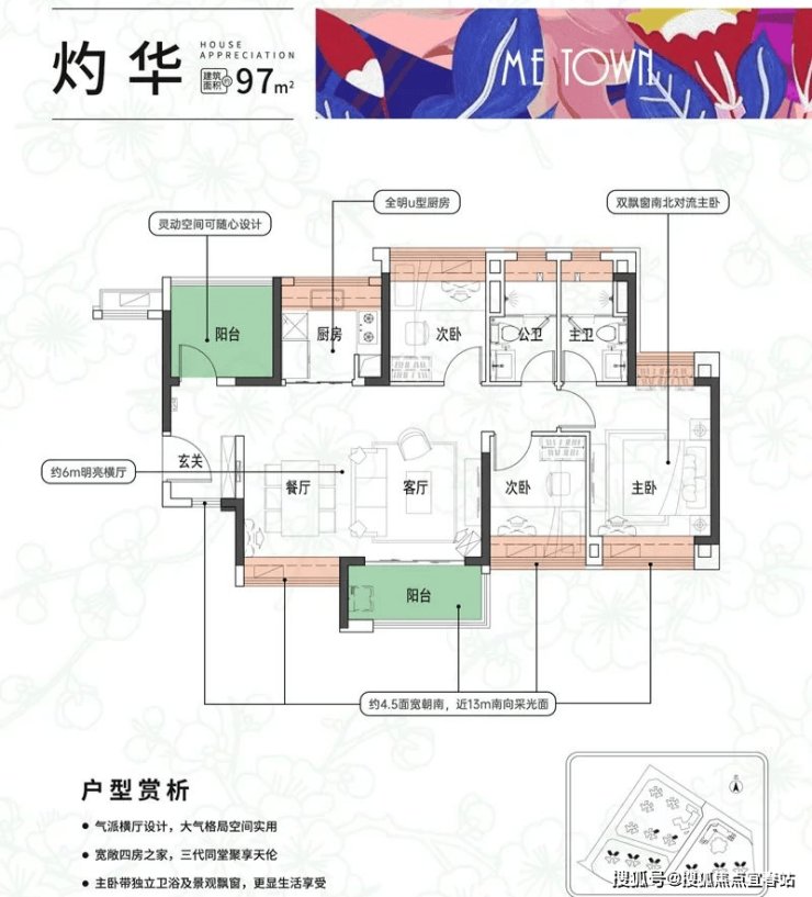 97平四房两厅两卫,做了横厅设计,餐厅、客厅、主卧、次卧,四开间朝南。