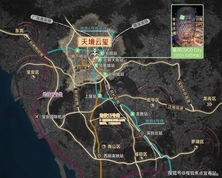 •光明星河COCO City,2025年12月19日已开业,3天客流突破了40万人次。盒马生鲜、寰映影城、海底捞、魔方城市书房等品牌荟萃。周边还有蓝鲸世界、万达广场为邻,繁华触手可及。