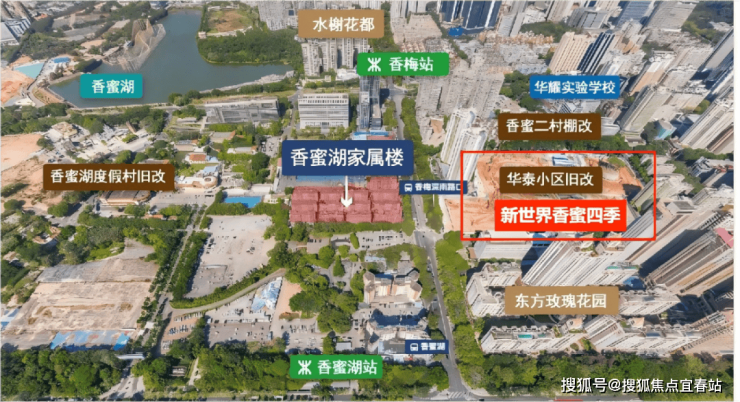 「新世界香蜜四季家园」位于福田区景田板块莲花街道香梅路与新闻路交汇处东北角,南侧是深圳高尔夫俱乐部,西临香蜜湖片区,东侧是「合正名园」。