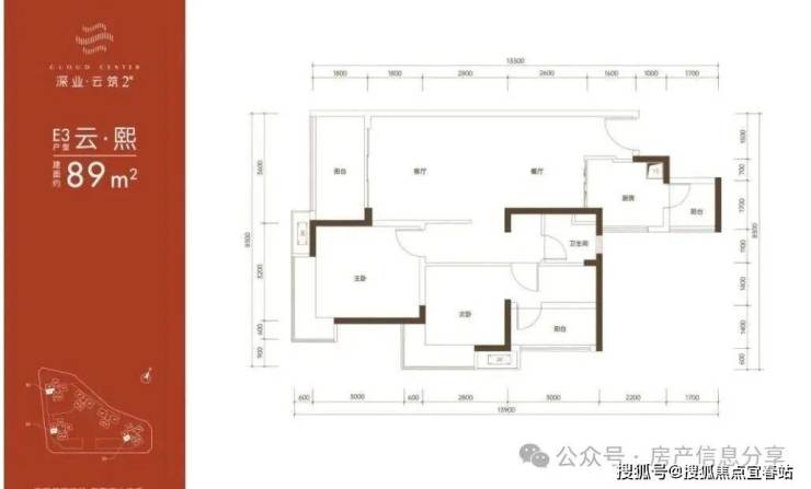 89㎡的3房2厅1卫,E2户型,设计的是竖厅格局,客厅3.6米开,3个卧室分别做到了主卧13.5㎡/次卧9.54㎡/次卧8.1㎡(含墙体飘窗),厨房带1个小生活阳台,得房率:79.89%(不含赠送),东南/西南或正南朝向。