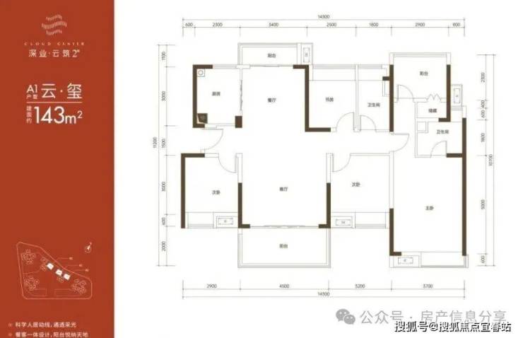 143㎡的5房2厅2卫,A1户型,设计的是竖厅格局,南北通透双阳台,客厅4.5米开间,5个卧室分别做到了主卧20.72㎡/次卧11.52㎡/次卧10.44㎡/次卧10.07㎡/次卧7.5㎡(含墙体飘窗),得房率:80.4%(不含赠送),阳台主朝正南向。