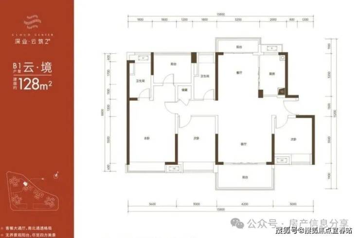 128㎡的4房2厅2卫,B1户型,仅5栋B单元的03号房才有,设计的是竖厅格局,南北通透双阳台,客厅4.2米开间,4个卧室分别做到了主卧19.44㎡/次卧12.3㎡/次卧12㎡/次卧10.5㎡(含墙体飘窗),得房率:79.71%(不含赠送),大阳台主朝正南向。