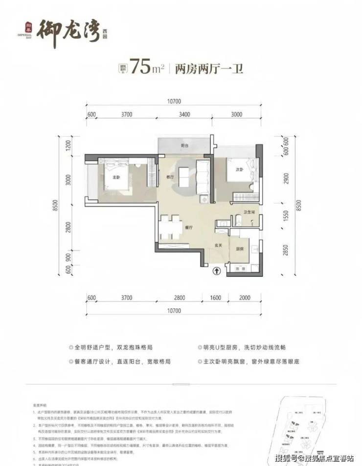 75㎡2房1卫,分布在1栋3/4单元03/06户型,设计的是竖厅稀缺的双龙抱珠格局,客厅开间3.4米,U型厨房,卫生间三段式分离设计,得房率约73.26%(不含赠送),东南或西北朝向,加上赠送得房率约80%