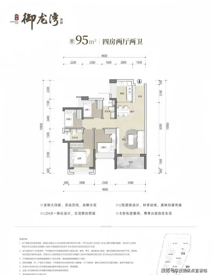 95㎡4房2卫,分布在2栋1单元06户型,设计的是竖厅南北通透格局,客厅开间3.5米,五开间朝南,U型厨房,公卫三段式分离设计,得房率约79.25%(不含赠送),阳台主朝东北向,加上赠送得房率约93%