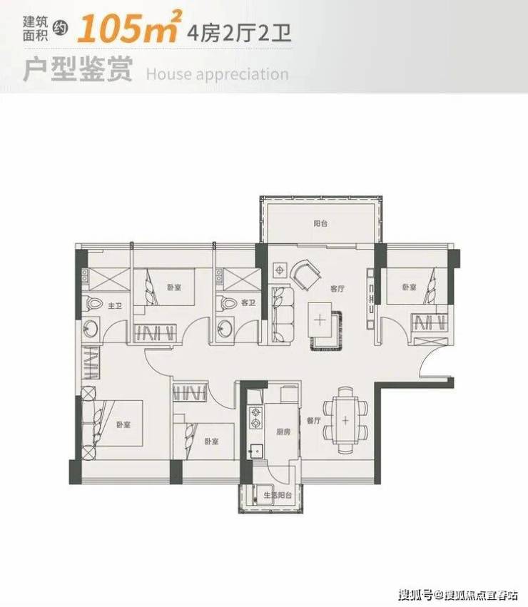 该户型是见惯的传统三房户型,亮点在于有双阳台设计,东南向10F以上视野越过前面的综合楼的裙楼会比较开阔。