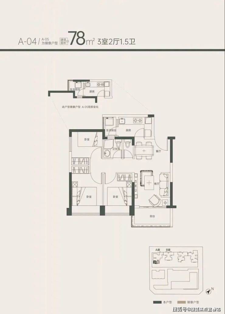 78㎡能做到三房+1.5卫+双阳台,功能性已经可以吊打科技园100㎡的新房。户型设计比较方正,1.5设计比较人性化,毕竟若三四口之家居住,多个马桶生活质素会提高很多。