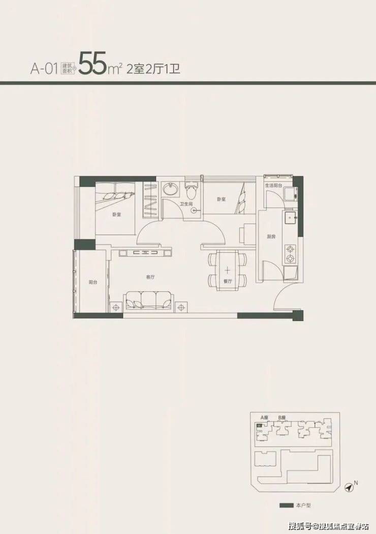 相较于55㎡户型这个两房的亮点在于厨房是真的太爽,还能设计推门整个空间看起来会比55㎡的两房大,东南向朝向也更优质。