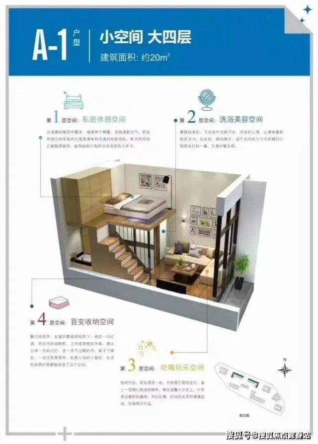 A-1户型品鉴:3.6米层高,单面采光,上下分层布局合理,收纳、起居、空间相对独立。较高的采光高度,足以满足室内自然光线的明亮,小阳台也可完全满足日常外界接触空间和晾晒的需求。