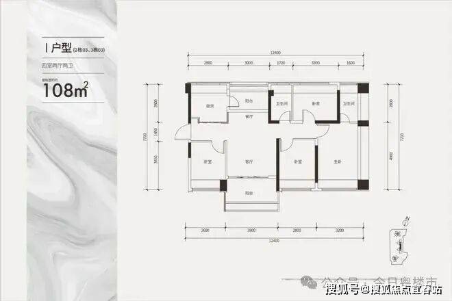 建面108㎡四房:双龙抱珠格局,客餐厅一体化设计,南北通透