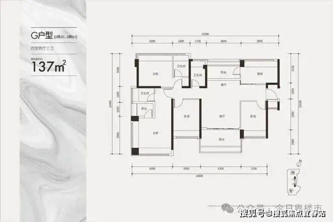 建面137㎡四房三卫:双套房设计,主卧带独立衣帽间及卫浴,私密性极佳