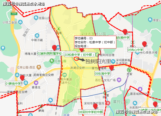 项目附近有多所小学,根据学区地图划分,小学方面,独树阳光里是处于由东昌小学、布心小学、东晓小学等8个小学组成的共享学区范围内,其中距离项目最近的是东昌小学,离项目仅197米;初中方面,独树阳光里是在松泉中学学区范围内,除此之外还有深圳市松泉实验学校、深圳奥斯翰外语学校及东湖中学等,教育资源整体丰富。