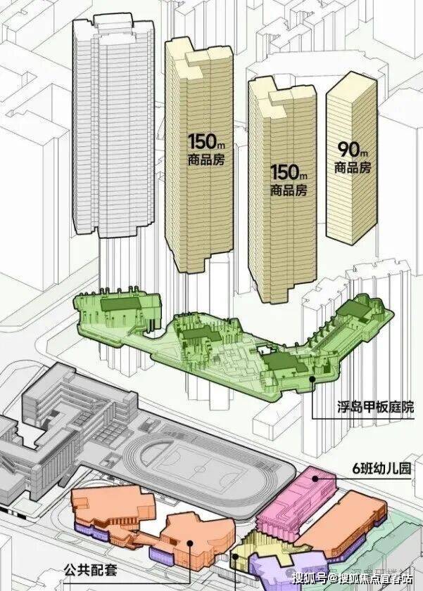 说直接点,就是将四栋建筑安置在这个甲板上,形成一个超级社区底盘+ 浮岛绿化甲板的模式。