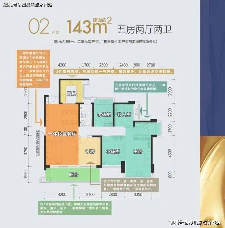02户型-143㎡五房两厅两卫:为市面少见的5房设计,户型方正、全明通透、4开间朝南,入户带宽阔玄关、客厅开间高达约4.2米、阳台面宽高达约6.9米,书房可与客餐厅打通、变成媲美大平层豪宅尺度的超大公区,是一步到位、终极改善的优选。