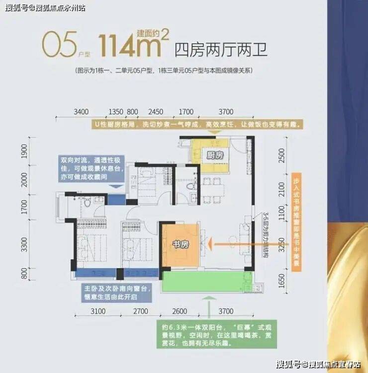 05/06户型-114㎡四房两厅两卫:王牌户型,户型方正、动静分离、4开间(3间卧室+客厅)朝南、南向面宽高达约12.1米,阳台可俯瞰茅洲河。