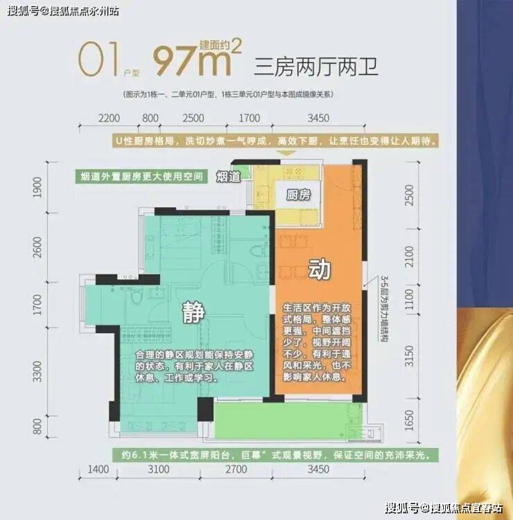 01户型-97㎡三房两厅两卫:户户朝南、格局方正、动静分离,约3.45米大开间客厅连接约6.2米大面宽阳台,客餐厅一体化设计,空间开阔、采光充足。