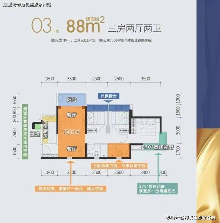 03/04户型-88㎡三房两厅两卫:大采光面、短进深、客厅开间高达约3.3米,入户带玄关,主卧套房设计、带270°拐角凸窗,在保证充分通风采光的情况下,更加大了赠送率,居住感非常舒适。