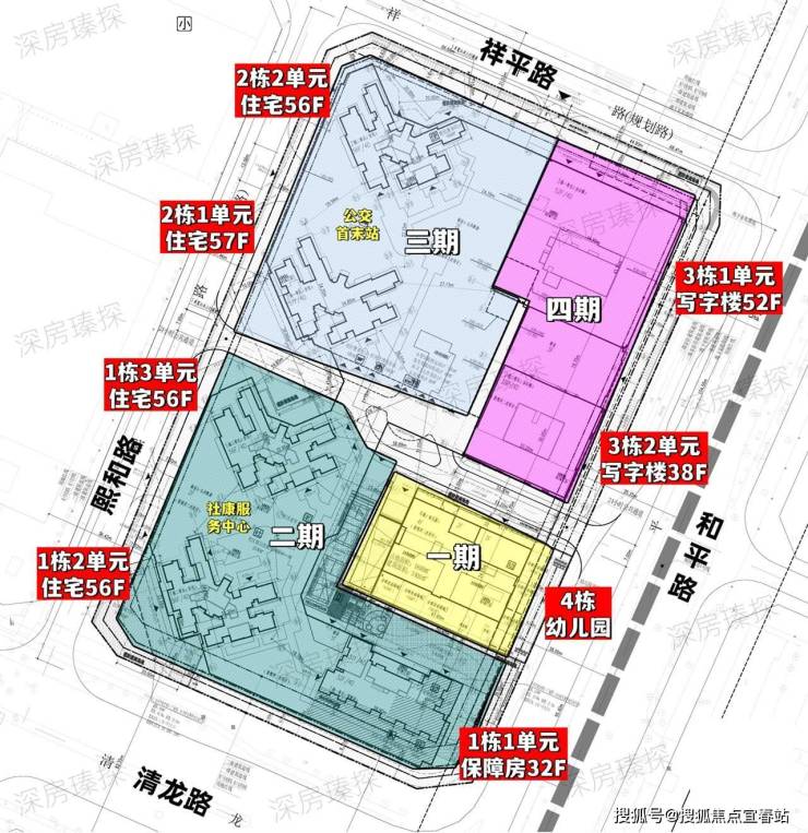 该项目共分4期开发,其中一期建设幼儿园,二三期建设住宅,总高56-57层的商品房,四期建设写字楼,总高38-52层,配建有公交首末站+社康服务中心+托育机构。
