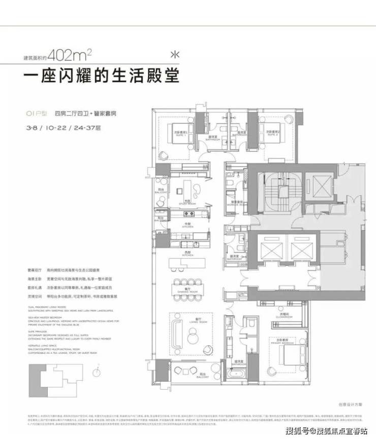 【户型规划】由4栋51至63层3.6-3.9米层高的纯居住奢装交付地标、两栋4.5米层高的小高层,35栋独栋,全景幕墙、宽景阳台。